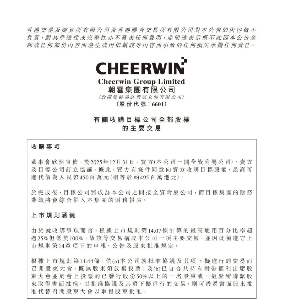 近日,朝云集团宣布,买方广州朝云控股有限公司、卖方(左玉龙、柳绪春、白述昌、贺建伟、何建宁、胡建国、辛传三、石景山、袁新乐、王学民、周紫燕及张坤元)及目标公司河北康达有限公司订立协议在线配资网,据此,买方有条件同意向卖方收购目标股权河北康达有限公司100%的股权,最高可能代价为人民币4.5亿元(相等于约4.95亿港元)。